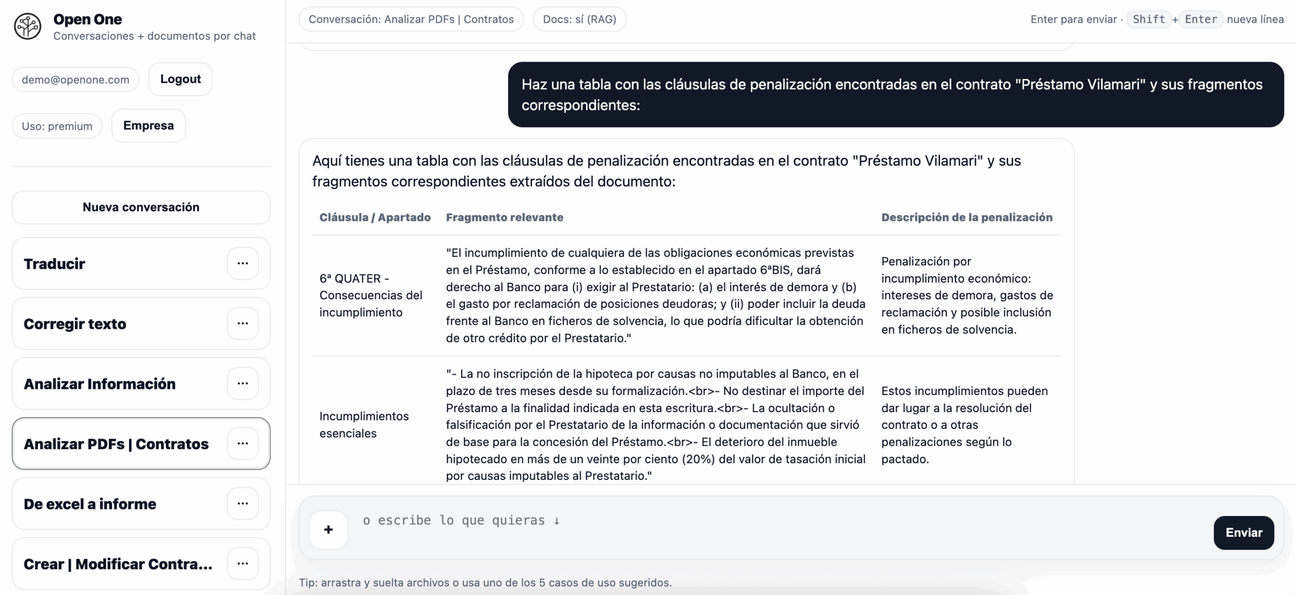A diferencia de otras herramientas, Open One no comparte ni reutiliza tu información. Tus documentos y preguntas son totalmente privados.